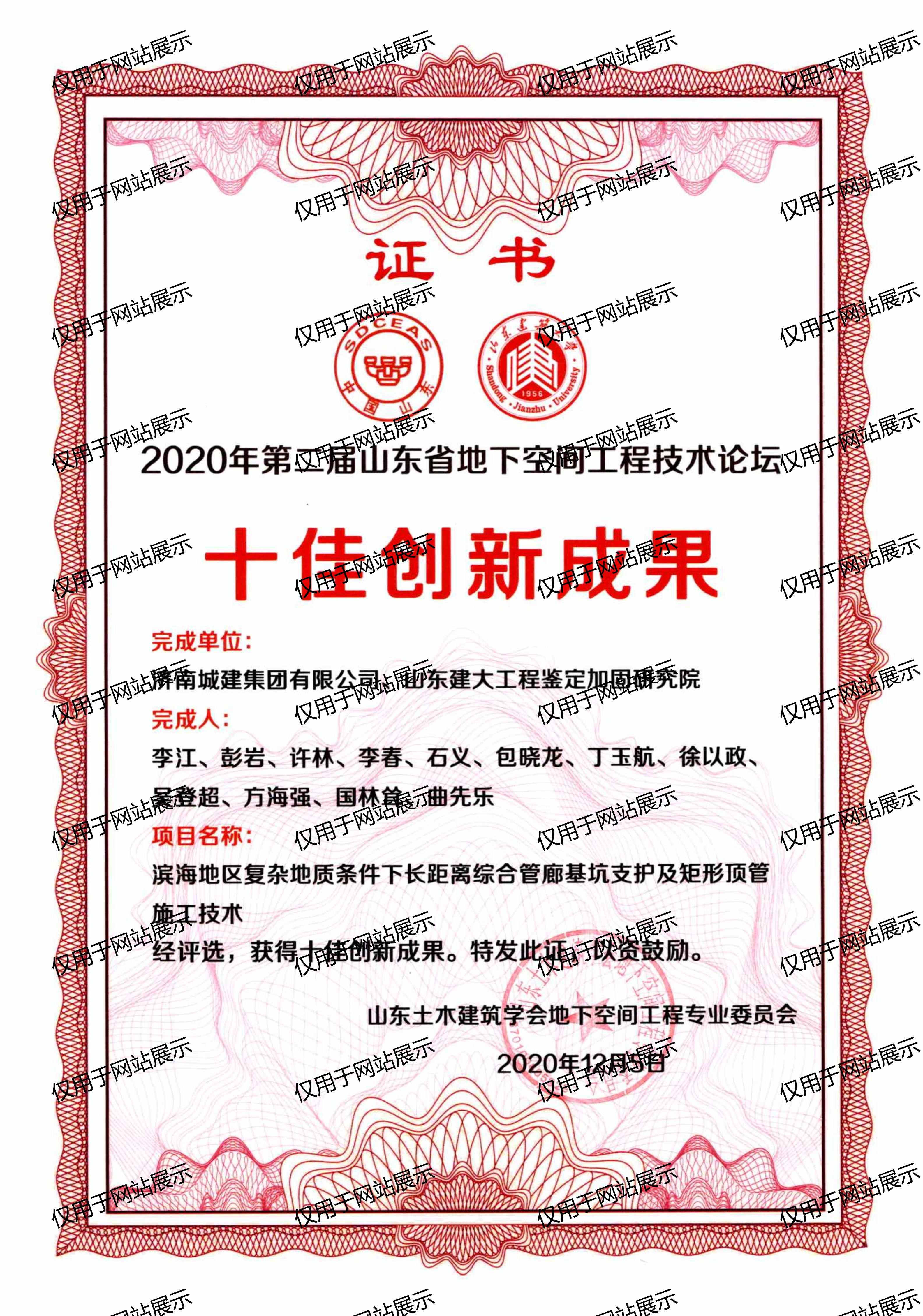 2020年第二屆山東省地下空間工程技術(shù)論壇十佳創(chuàng)新成果
