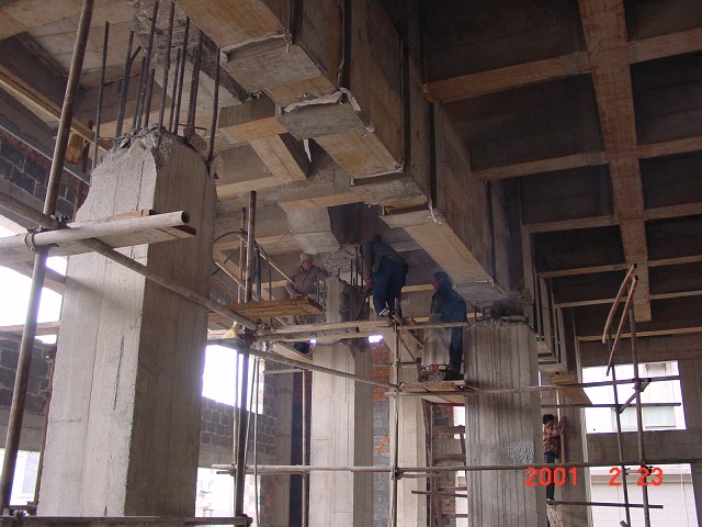 濟(jì)南勝利石油大廈,原辦公室改為大會(huì)議室,抽三根框架柱,采用上翻預(yù)應(yīng)力梁結(jié)合腹板柱空腹桁架轉(zhuǎn)換結(jié)構(gòu)進(jìn)行加固改造處理,既滿足了安全要求,又滿足了使用功能的改變。