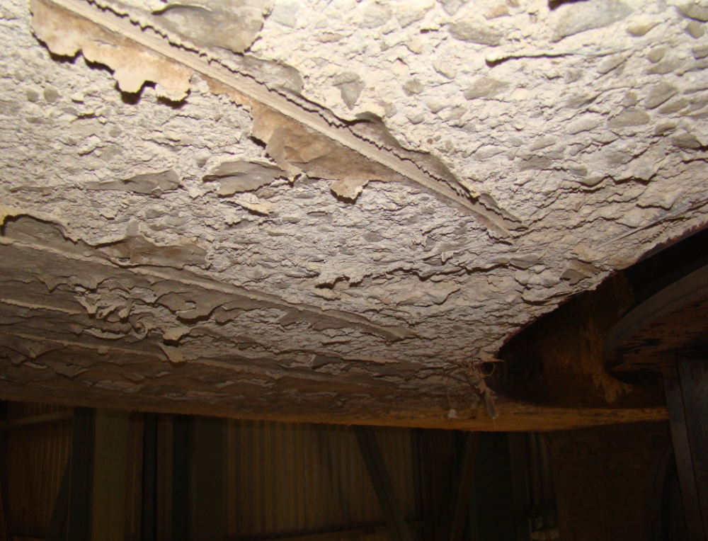 窯未投入使用即發(fā)現(xiàn)框架頂部耐熱混凝土出現(xiàn)劣化現(xiàn)象,混凝土強(qiáng)度偏低。投產(chǎn)后混凝土劣化逐漸加重(圖2~4)。遂委托我院對(duì)其進(jìn)行檢測(cè)鑒定。