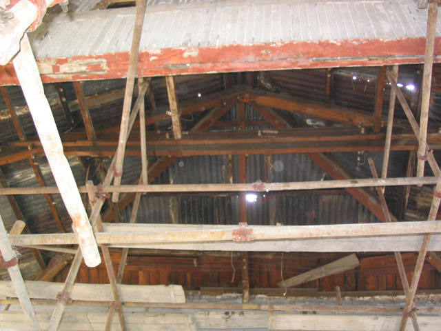 小廣寒影劇院原結(jié)構(gòu)為磚、石、木、鋼混和結(jié)構(gòu)。墻體由亂石、粘土磚用粘土、石灰雜砌而成,中間為鋼柱-鋼梁支撐,屋架為木結(jié)構(gòu),屋面為鐵皮屋面。室內(nèi)頂棚為板條麻刀粘土石灰頂棚,隔墻為木柱、木腰梁半磚隔墻。看臺為木結(jié)構(gòu)看臺,木樓梯。小廣寒影劇院因年久失修,磚石墻、屋架、看臺、隔墻等大部分已破損、腐爛。本次修繕工作本著“修舊如舊”的原則,對建筑物進(jìn)行了針對性的改造加固