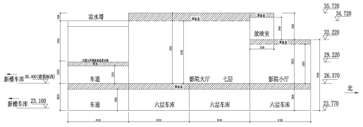 根據(jù)經(jīng)營要求,建筑物東側(cè)單體需進(jìn)行加層改造,加層后,原五層頂屋面變?yōu)榱鶎樱鳛檐噹旎蚪?jīng)營使用,原五層新世紀(jì)影城搬遷至新建七層。加層設(shè)計時,結(jié)構(gòu)標(biāo)高布置需在滿足影廳凈高要求的同時兼顧新加樓層與周邊建筑物車道的交通銜接、屋頂涼水塔、影院放映廳、已有樓梯、電梯等,平面、剖面布置較為復(fù)雜,剖面見圖2。
