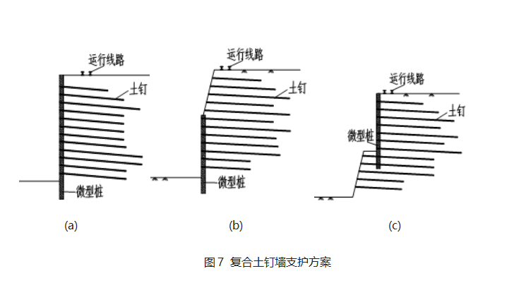 (3)方案三:考慮到以上方案的優(yōu)缺點(diǎn),我單位提出基坑上部采用微型樁+土釘錨桿的擋土墻形式,下部采用傳統(tǒng)土釘墻形式(圖3c),該方案得到建設(shè)單位和監(jiān)理單位的認(rèn)可,并獲得實(shí)施。該方案