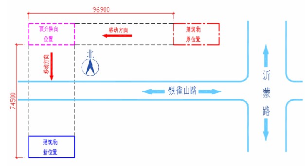 2000年底,為了不影響新規(guī)劃的“臨沂市人民廣場(chǎng)”的建設(shè),同是也為了節(jié)省投資、減少污染,將其先向西平移96.9m,再向南平移74.5m,總移動(dòng)距離171.4m,平移共用25天,平均速度為1.5-2.0m/h。