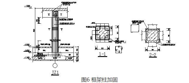 現(xiàn)場檢測發(fā)現(xiàn),車庫上浮導致柱開裂且絕大部分柱產(chǎn)生了受壓區(qū)混凝土壓碎現(xiàn)象,柱發(fā)生受壓破壞,故采用加大截面方法對車庫內(nèi)55棵框架柱進行加固。原柱每邊外擴10cm,增設豎向鋼筋及箍筋,采用高強免振搗灌漿料澆筑,見圖6。