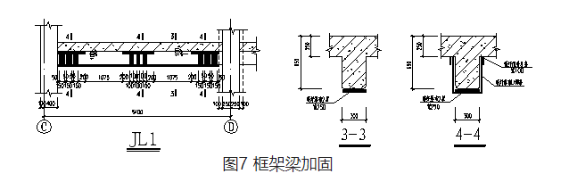 車庫頂梁破壞情況較輕,灌縫后采用粘貼碳纖維加固方法加固,對產(chǎn)生斜裂縫的梁在梁端增設碳纖維U形箍加固,對梁底出現(xiàn)受拉裂縫的梁在梁底粘貼碳纖維加固,見圖7。